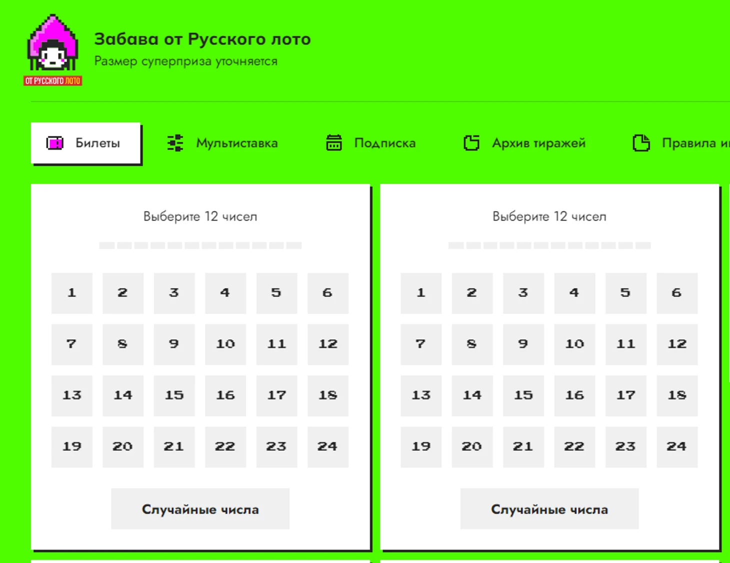 После выбора лотереи игрок попадает на страницу с лотерейными билетами. Они не заполнены. В каждом билете находится 24 числа от 1 до 24. Для приобретения игрового купона необходимо отметить 12 любых чисел. После этого можно переходить к оплате купона.