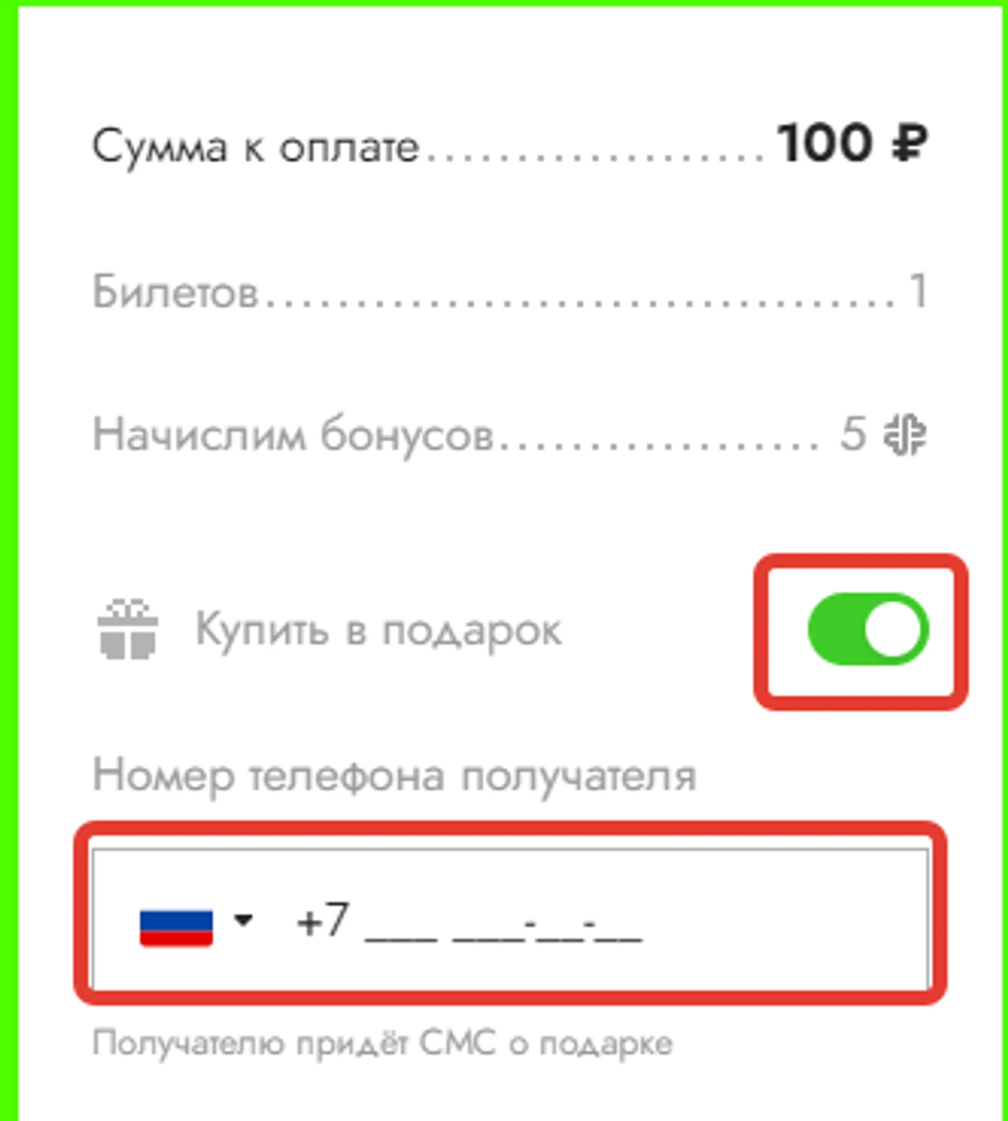 На картинке: покупка лотерейного билета в подарок, красным выделен виджет и поле для ввода номера телефона того, кому хотите подарить билет