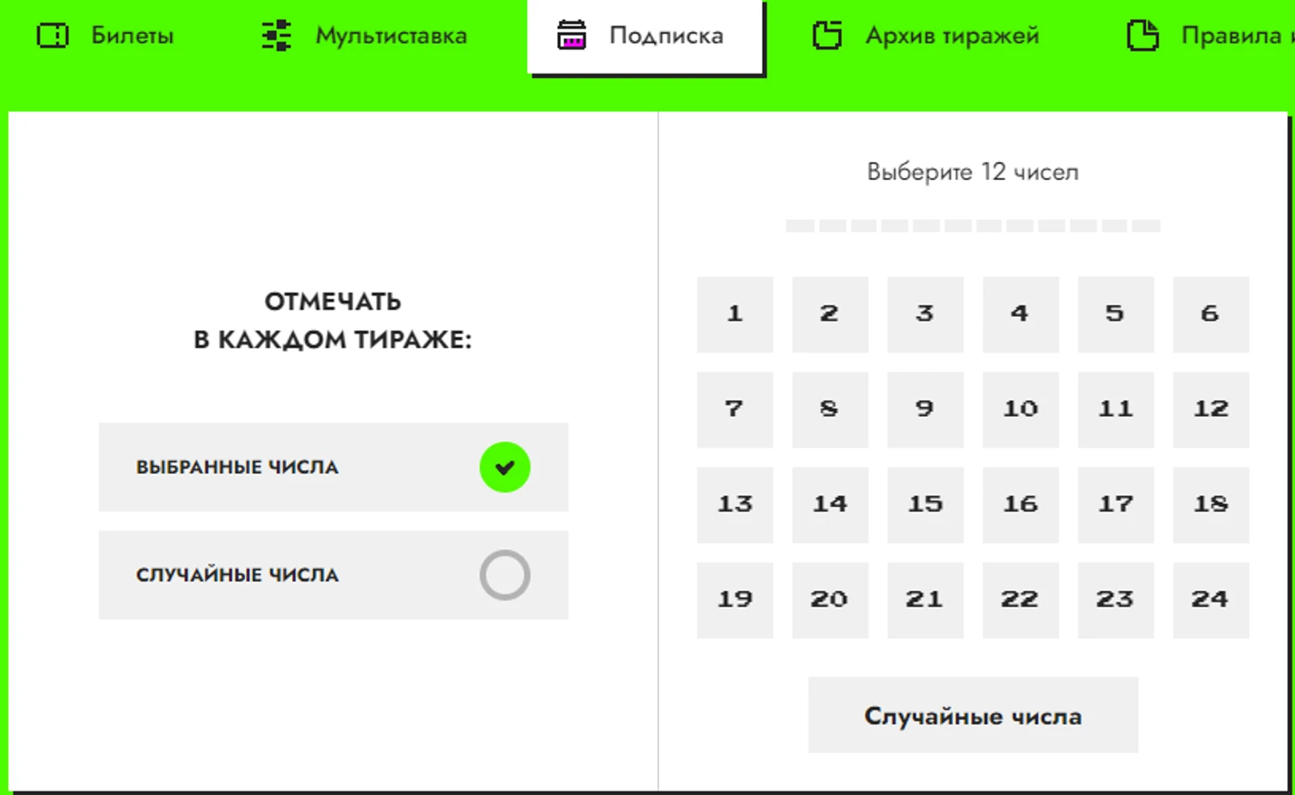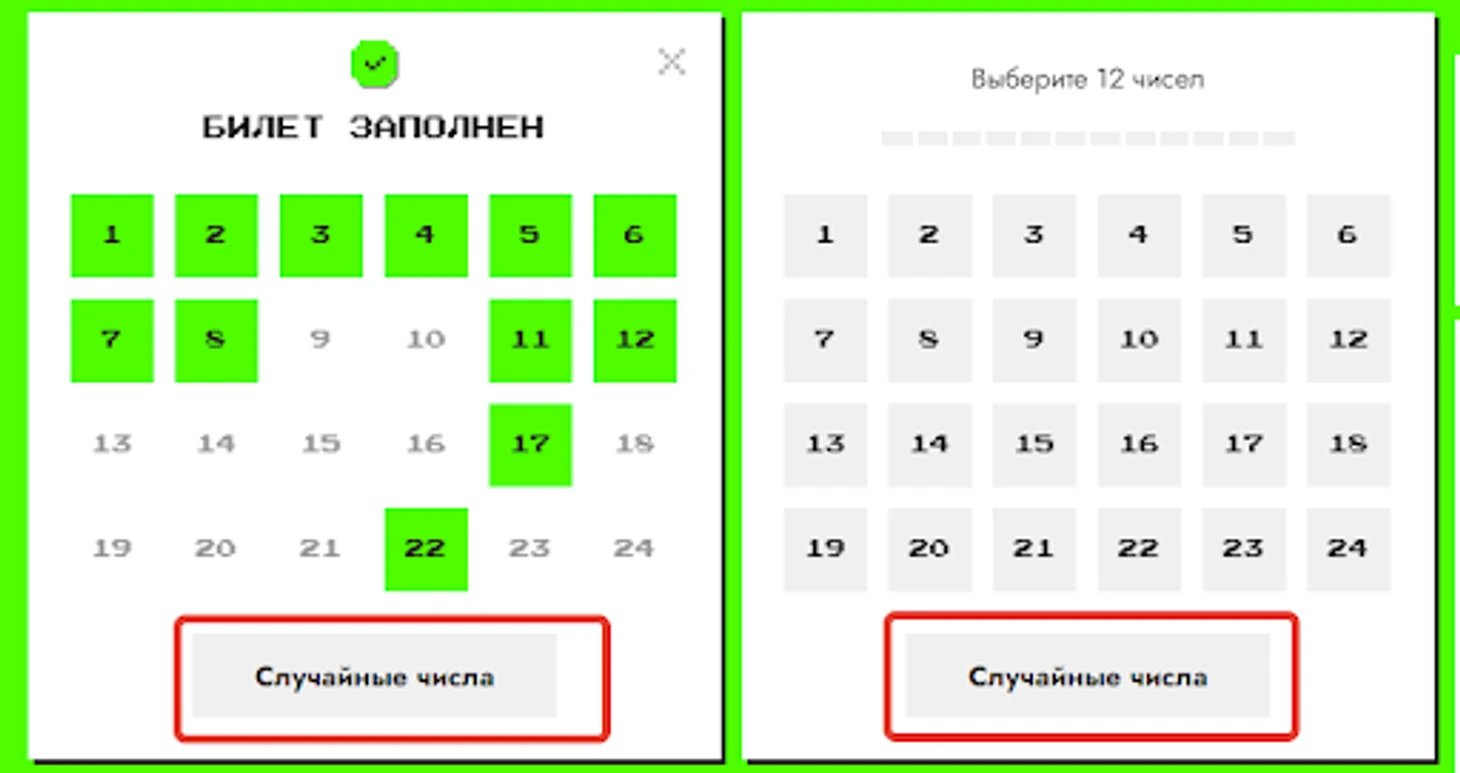 В игровом купоне представлены числа от 1 до 24. Игроку необходимо выбрать любые 12. Можно ввести самому или нажать на кнопку «Случайные числа».
