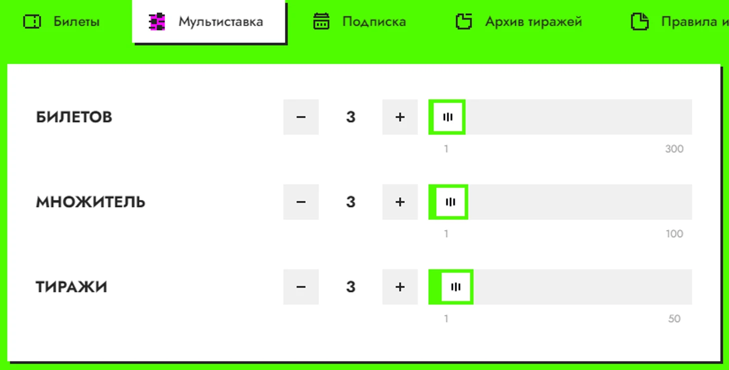 На сайте «Столото» есть опция «Мультиставка». Она позволяет быстро приобрести несколько билетов. В рамках услуги игрок может выбрать: