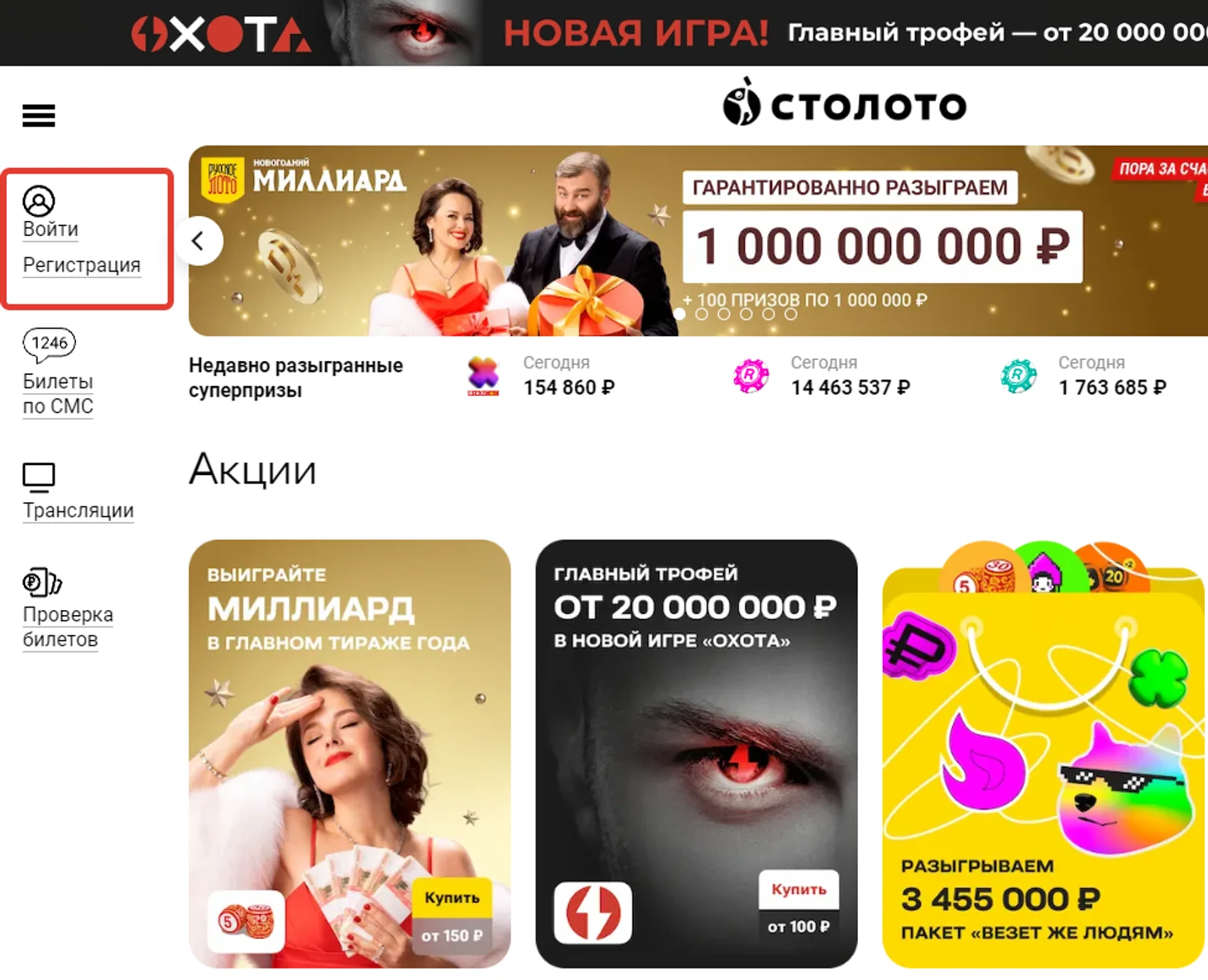 На картинке: главная страница сайта Столото, красным выделены кнопки Войти для авторизации и Регистрация для создания учетной записи