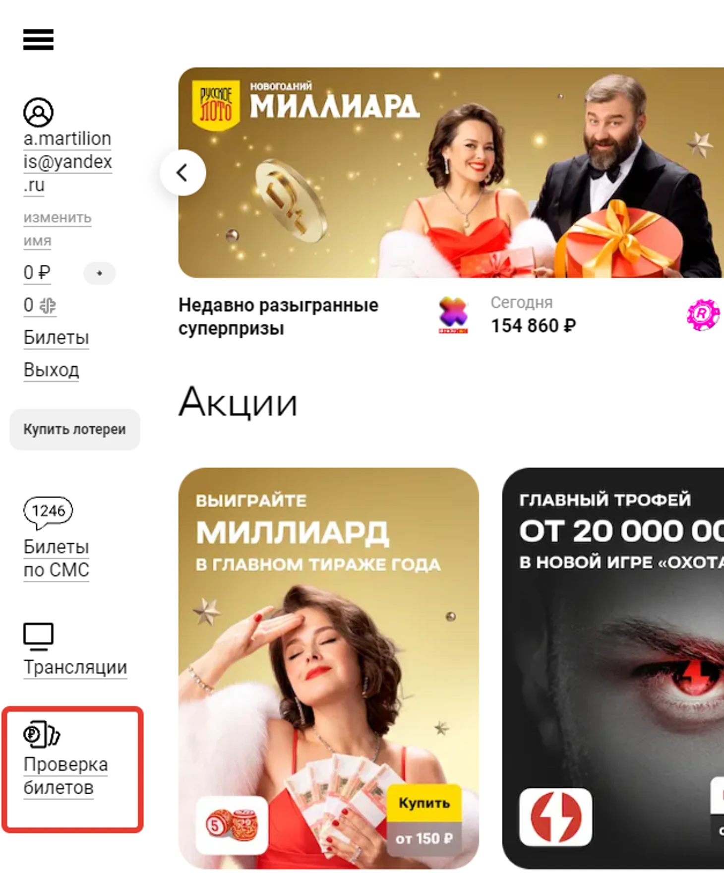 Для получения результатов розыгрыша необходимо открыть раздел «Проверка билетов». Кнопка находится в левом нижнем углу на главной странице.