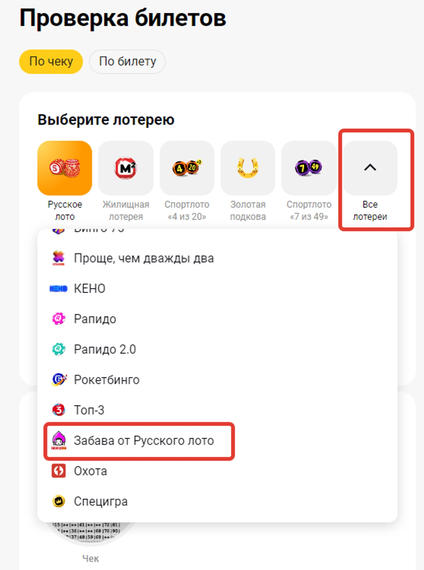 На картинке: раздел Проверка билетов, красным выделена лотерея Забава от Русского лото в общем списке