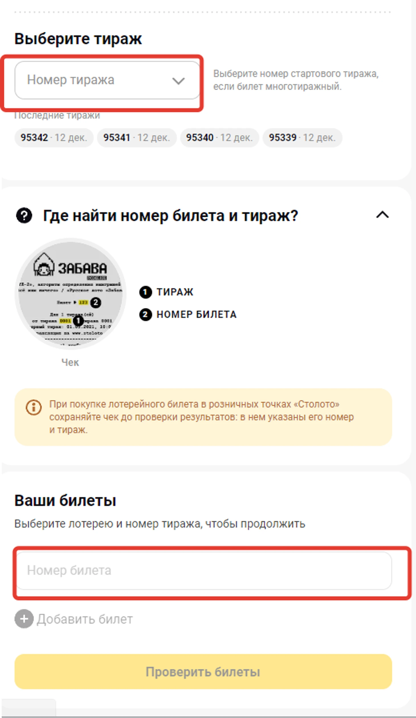 На картинке: проверка билета, красным выделены поля для выбора тиража и ввода номера билета