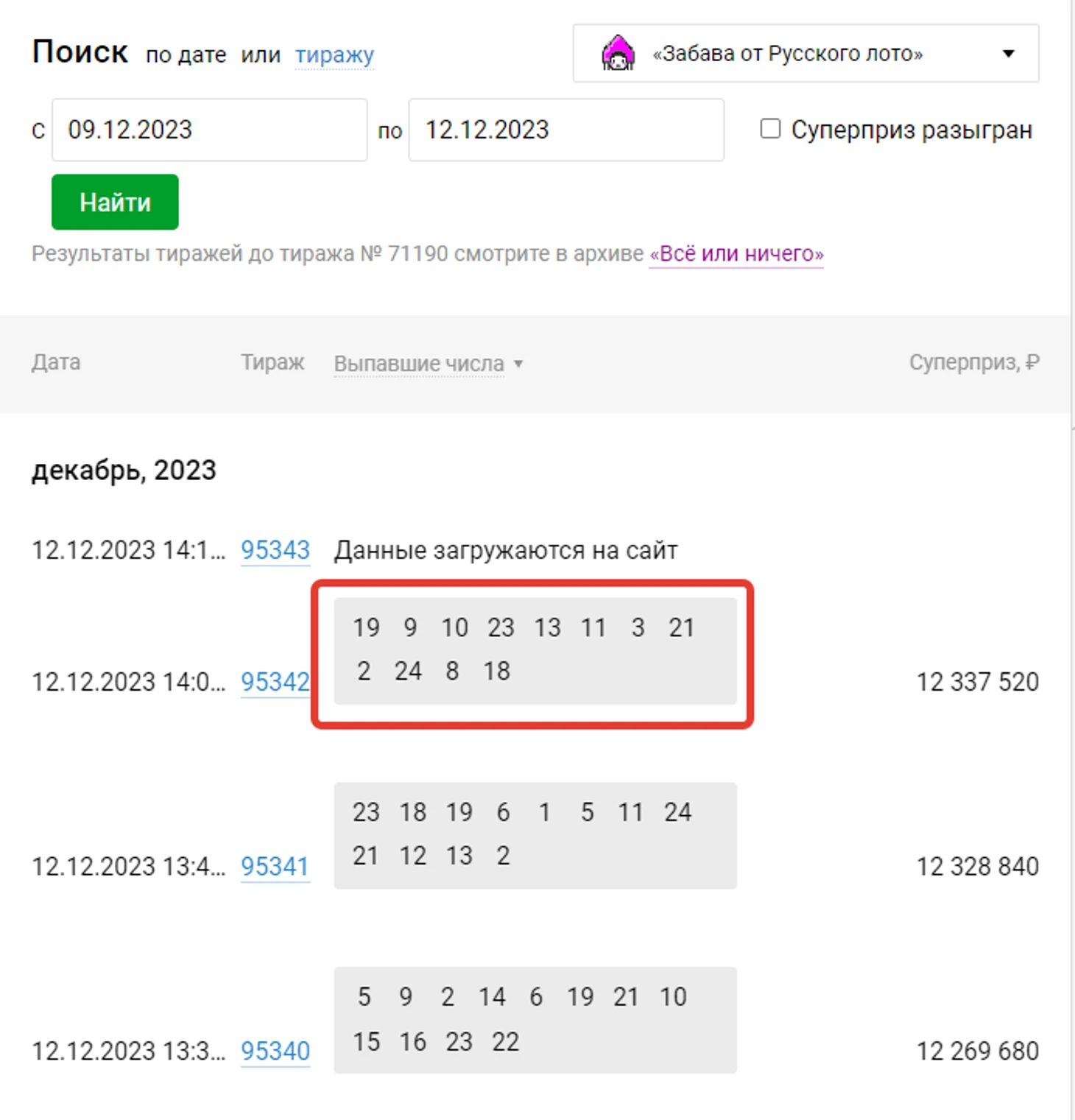 На картинке: раздел Архив тиражей, красным выделена призовая комбинация в выбранном тираже