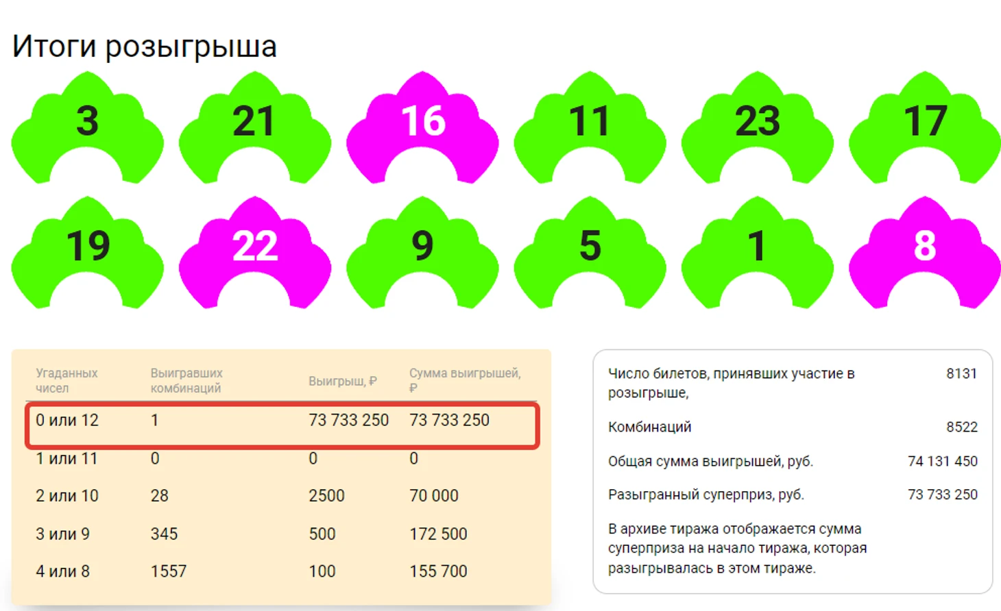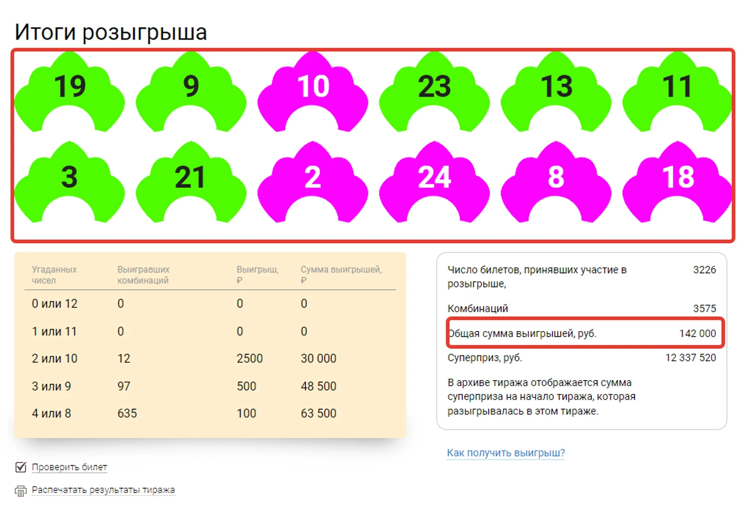 На картинке: итоги розыгрыша лотереи, красным выделена выпавшая комбинация и общая сумма выигрышей в тираже