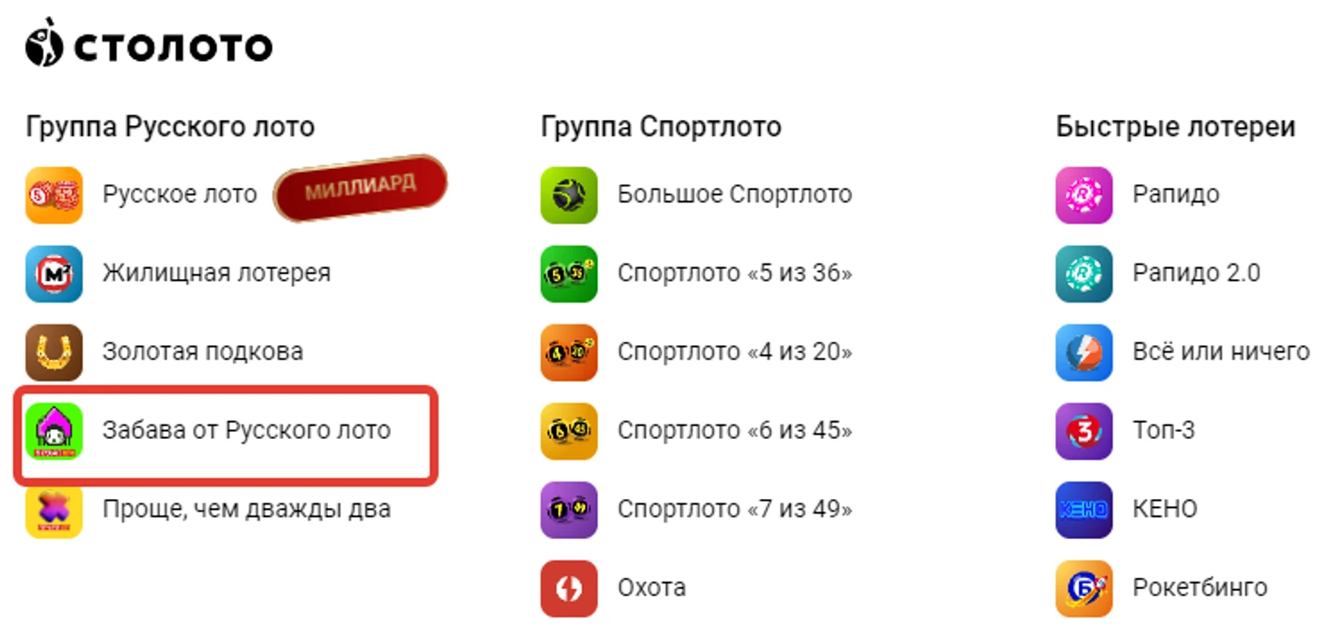 На картинке: общий список лотерей, красным выделена лотерея Забава от Русского лото