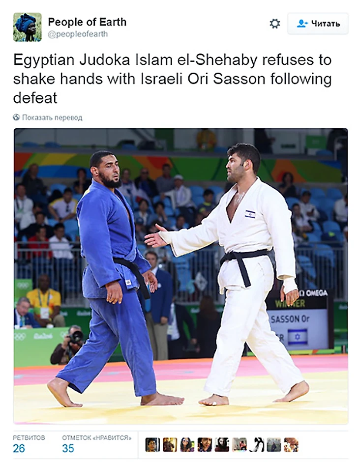 Египтятин вышел на татами и быстро проиграл, а затем началось самое интересное. Сассон приблизился к Эль-Шехаби для рукопожатия (в дзюдо это не протокольный элемент, достаточно поклонов до и после боя) – египтянин попятился назад и покачал головой. Его освистали, судья скомандовал немедленно дать поклон – Эль-Шехаби быстро кивнул и ушел. Журналисты не дождались его комментариев.