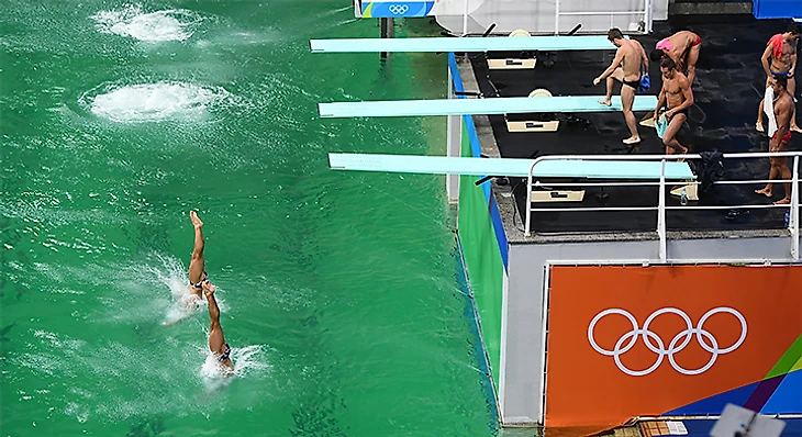 Поначалу организаторы Игр связывали изменение цвета воды с наплывом водорослей при жаре и отсутствии ветра – но первичная фильтрация не помогла и даже немного помешала. Некоторые спортсмены, особенно ватерполисты из соседнего бассейна, жаловались на резь в глазах – видимо, из-за перебора с хлоркой.
