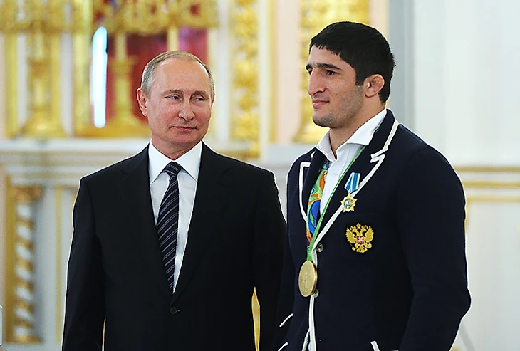 Путин в компании с олимпийским чемпионом по вольной борьбе Абдулрашидом Садулаевым, который пока ни разу не проиграл на ковре.