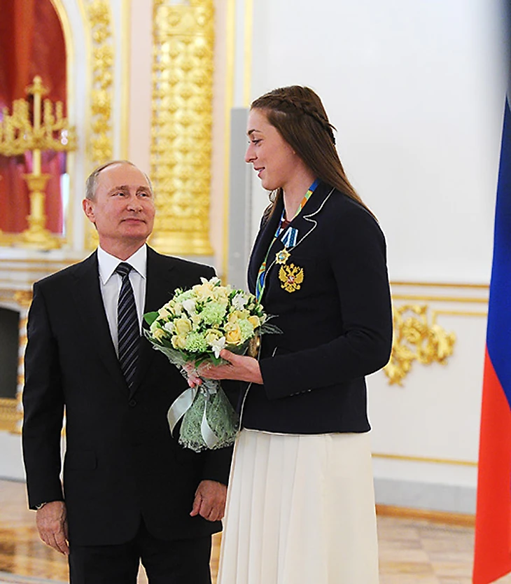 Олимпийская чемпионка по гандболу Виктория Жилинскайте смотрит на президента сверху вниз.