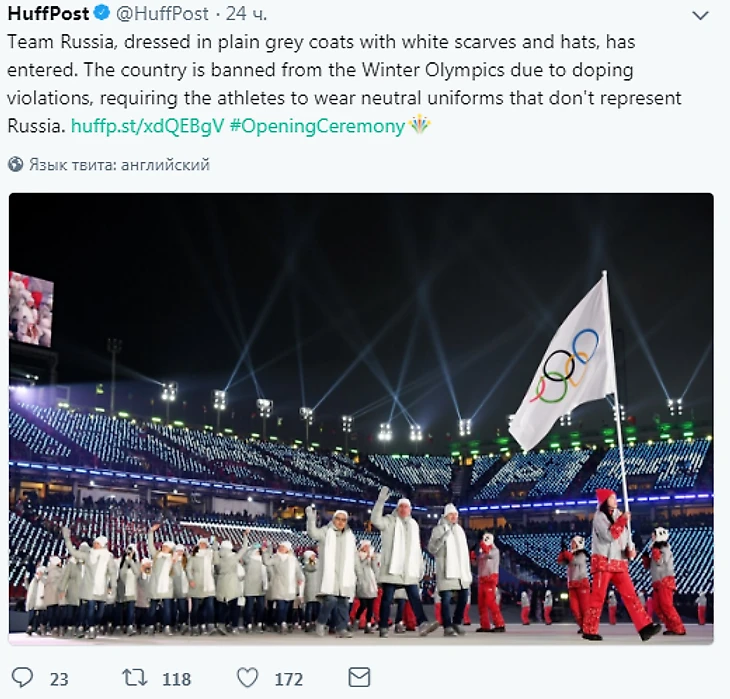 Во время церемонии открытия Игр, американское новостное издание «The Huffington Post» опубликовало твит с фото российской сборной на дорожке Олимпийского стадиона и пояснением по поводу того, что, согласно решению МОК, россияне вынуждены быть одетыми в нейтральную униформу.