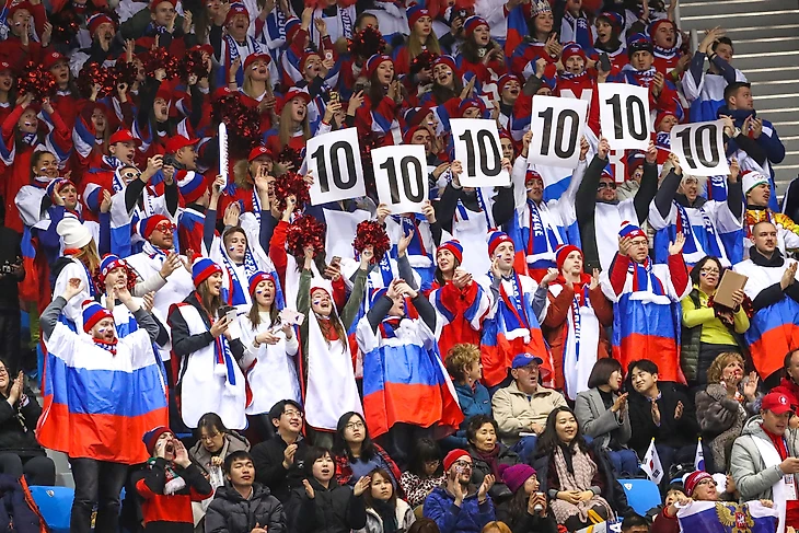 Формально Россия отстранена от зимних Олимпийских игр, но во время командных соревнований по фигурному катанию в воскресенье это было не слишком очевидно. Группа поддержки размахивала российскими флагами, а ее представители были одеты в красно-бело-синие пончо и хоккейные свитера цветов российского триколора, а также в сорочки и шапки с надписью: «Россия в моем сердце».