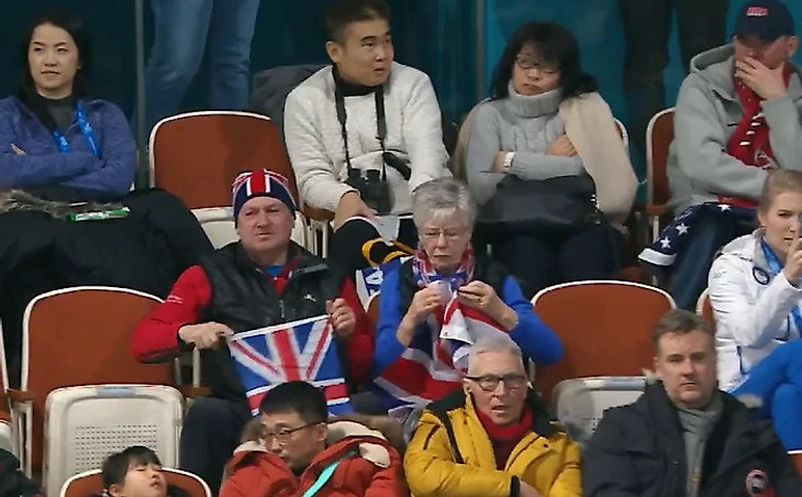 10.00. Вот такая публика ходит на керлинг в Пхенчхане. Они там вяжут британские флаги прямо по ходу дела?