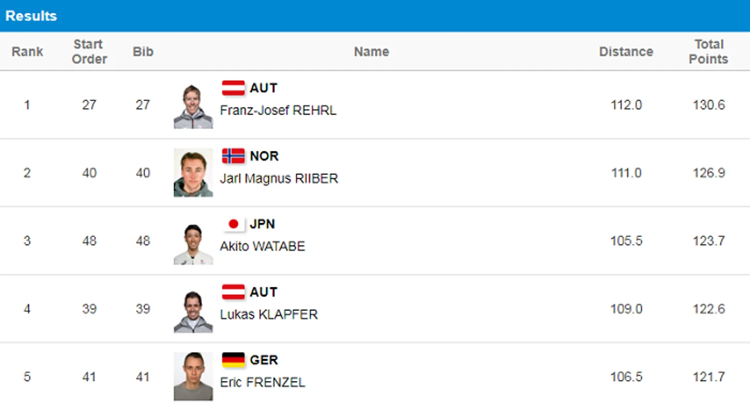 12.35. Второе место занял японец Ватабе. Важно уточнить, что это Акито Ватабе. Его брат Йошито финишировал 12-м. Бронзу завоевал австриец Лукас Клапфер.