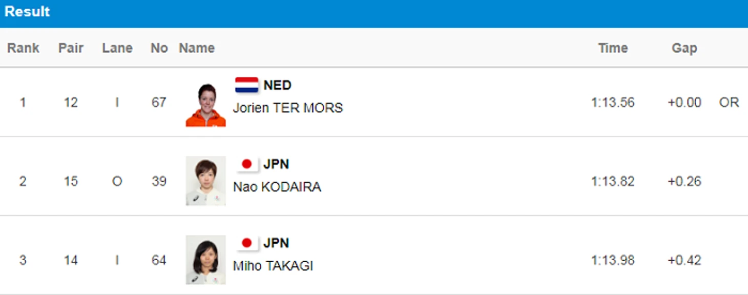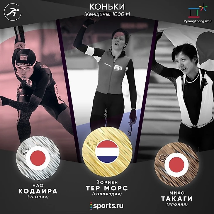 14.15. Очередная оранжевая победа на конькобежной арене! Голландка Тер Морс взяла золото и побила олимпийский рекорд, пробежав километр за 1:13.56. Еще две медали достались спортсменкам из Японии.