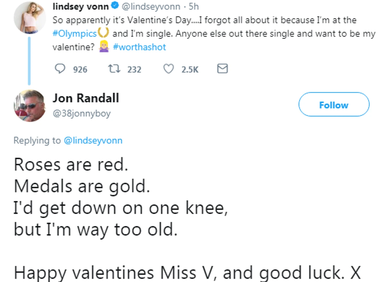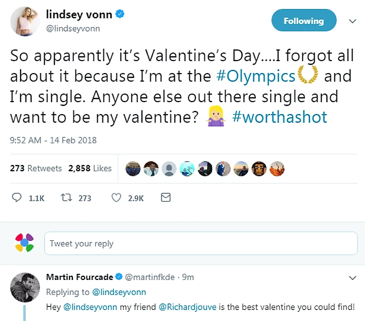 14.25. В твиттере все еще подкатывают к Линдси Вонн, которой не хватает пары на Валентинов день.