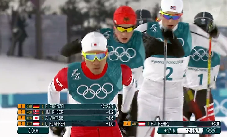 12.24. Двоеборцы пробежали три четверти пути. Рерль отвалился. Лидирует немец Френцель. Японец Ватабе держится!