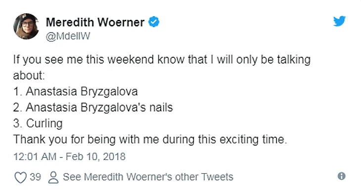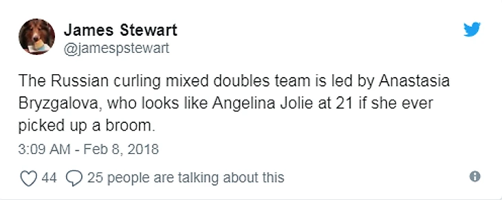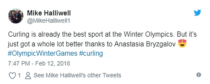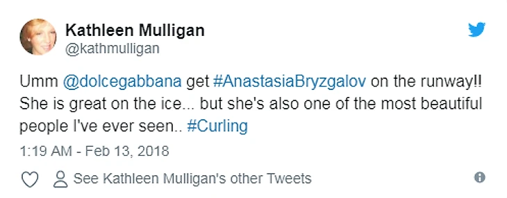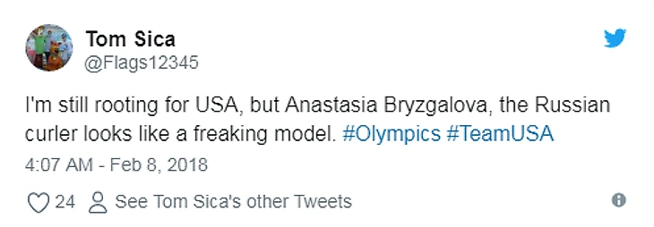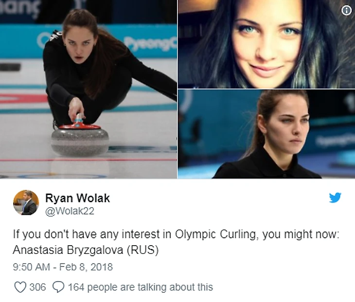 И ее выступления не проходят незамеченными. Том Сика написал в Твиттере: «Я по-прежнему болею за США, но российская керлингистка Анастасия Брызгалова выглядит как чертова модель».