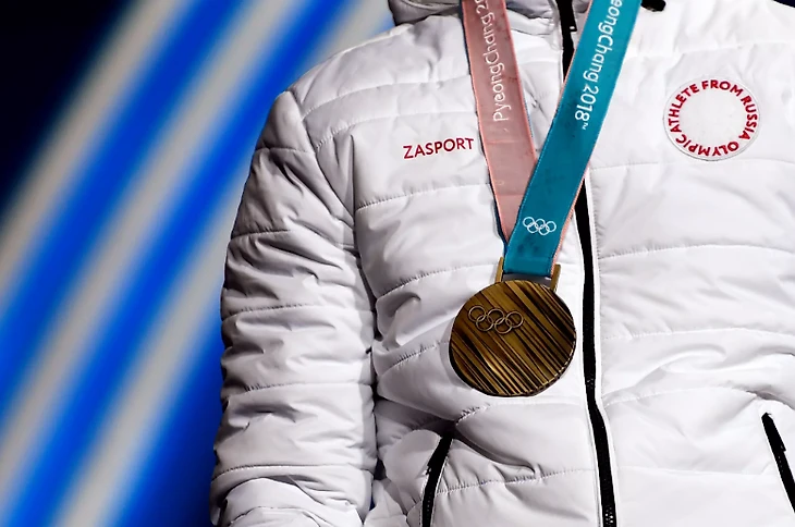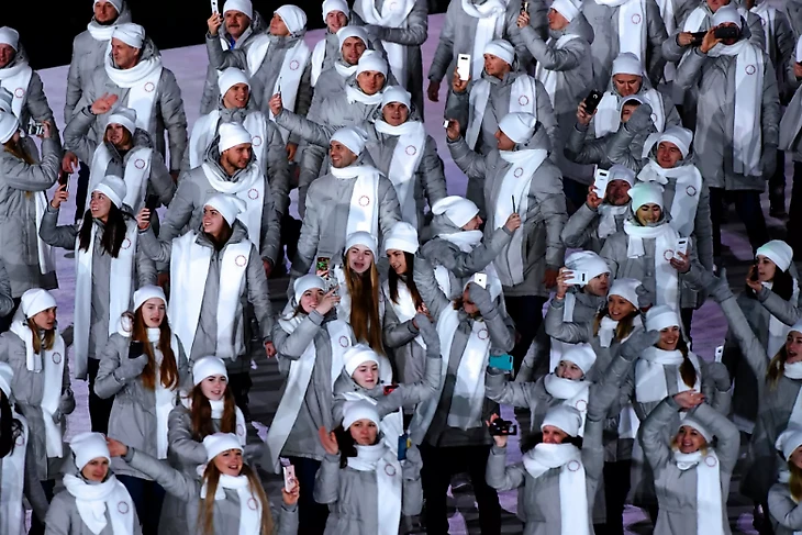Возле имен спортсменов по телевизору демонстрировался флаг Олимпийских игр. Поднимался он и на медальных церемониях, хотя количество медалей, завоеванных ими, и было умеренным, потому что многие из тех, кто выигрывал награды в Сочи, отсутствовали здесь из-за обвинений в употреблении допинга. Лишь на 14-й день, усилиями Алины Загитовой в женском фигурном катании, Россия завоевала свою первую золотую медаль.