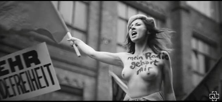 В клипе есть два образа – марширующих полицейских в касках, которые символизируют власть, и слегка похотливых и голых (куда ж без этого, Rammstein все-таки) женщин-бунтарей, сражающихся за свободу слова. Вполне вероятно, образ обнаженной дамы Линдеманн использовал, учитывая и современные реалии – сейчас феминистки активно сражаются за права, а эпатажные барышни из организации FEMEN даже готовы стоять за них голой грудью.