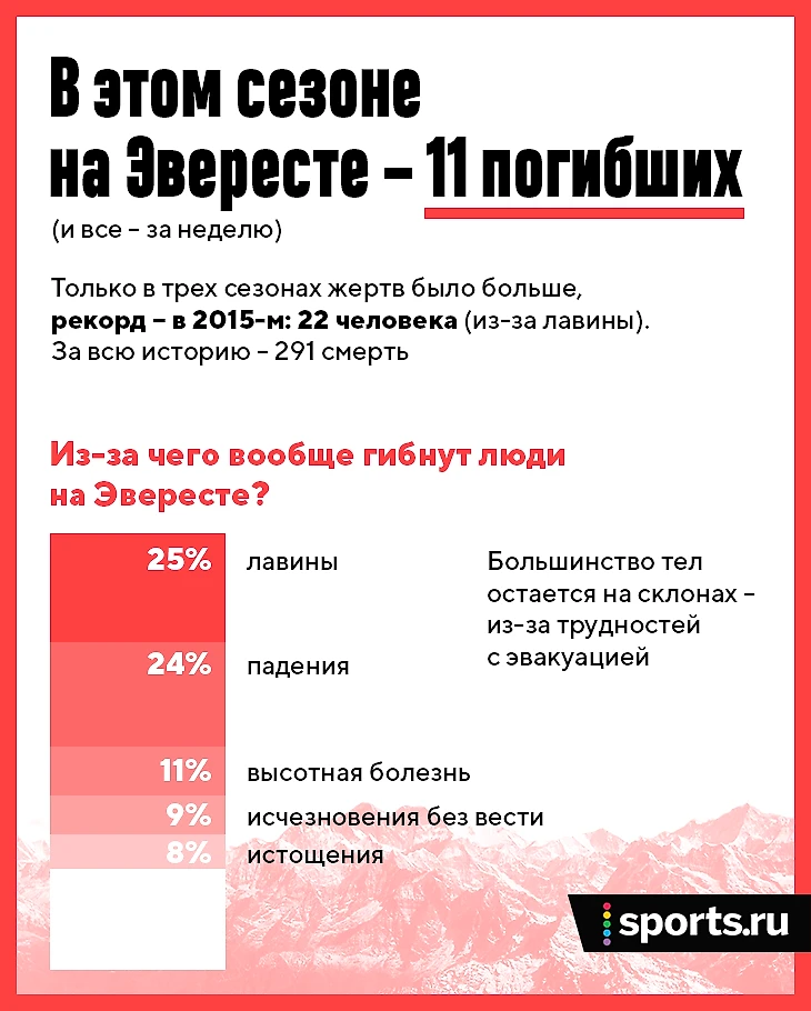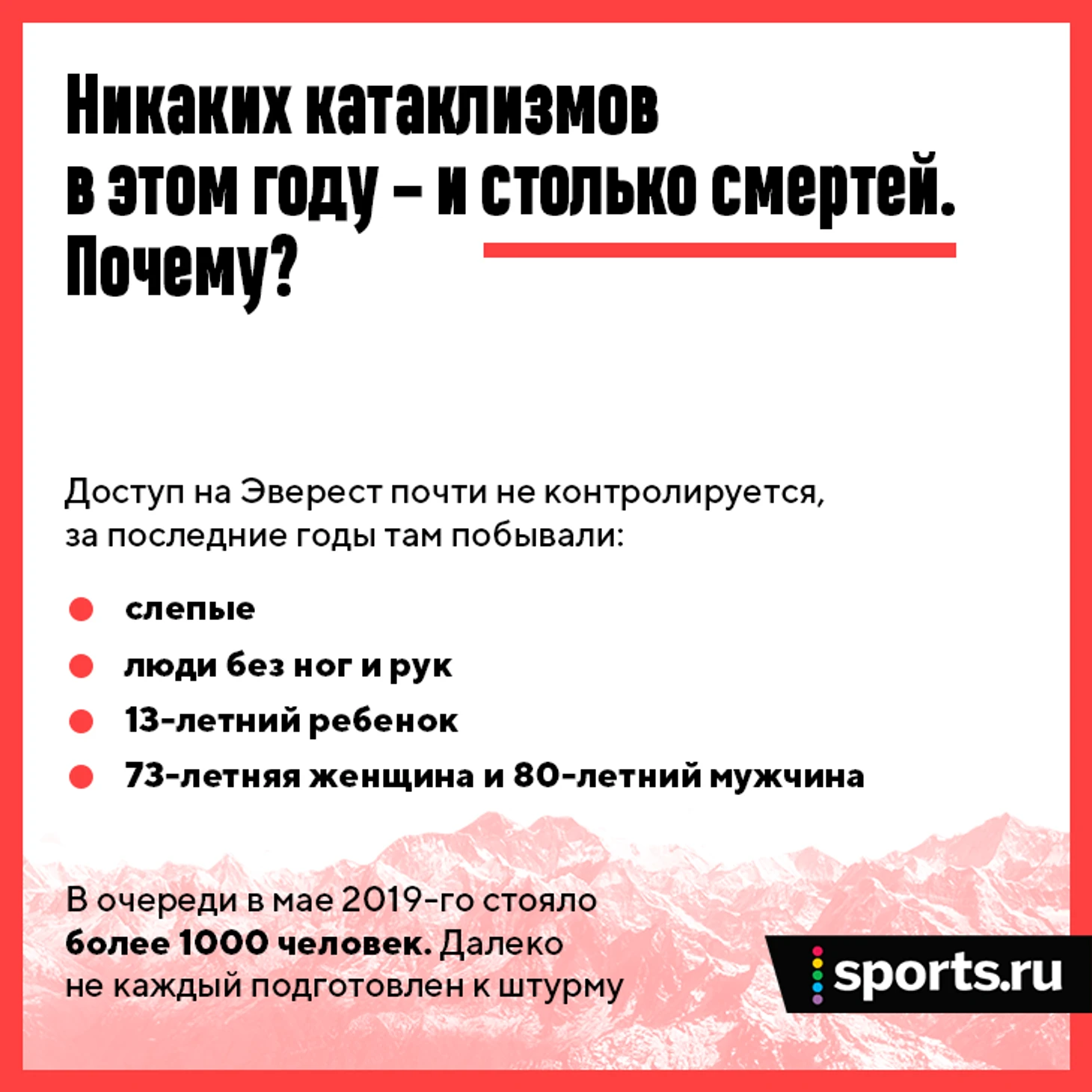 Май-2019 стал одним из самых трагичных периодов для главной горы планеты (8848 метров): из-за гигантского потока желающих и неважной погоды (всего 5 дней-окон для попыток) на подъеме со стороны Непала образовались очереди. В них и из-за них гибли люди, не всегда подготовленные к штурму.