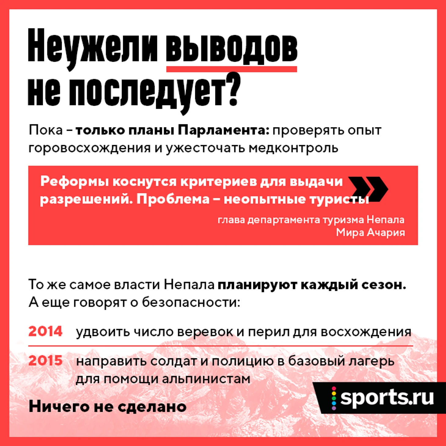Теперь – итоги. Эти и некоторые другие данные уже изучает высшее руководство Непала, откуда проще всего начинать восхождение. От страны ждут выводов.