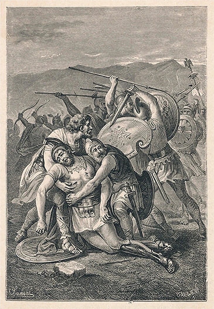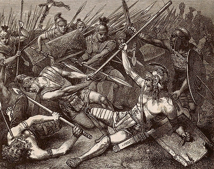 За счет мудрой тактики и хорошей реакции он избегал серьезных ранений. Римляне испытывали первобытный страх перед отчаянным, невероятно сильным медом, рычавшим во время каждой своей атаки как бешеный зверь. Но они теснили его количеством.