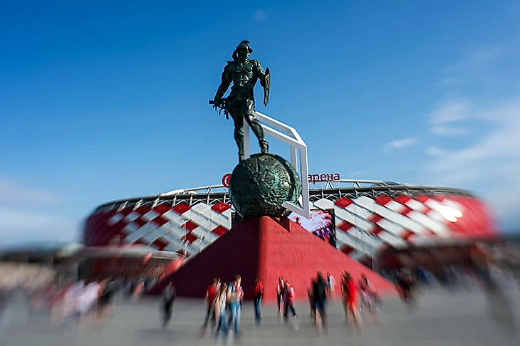 Перед северной трибуной «Открытие Арены» установлена бронзовая статуя гладиатора, в которой, конечно же, просматривается образ вождя повстанцев – сильно потрепанного в боях. Фанаты придумывают перформансы, связанные со Спартаком – пару лет назад они принесли на матч баннер с изображением трех гладиаторов верхом на конях, естественно, с унизительным для ЦСКА подтекстом (животные были с красно-синими гривами и выпученными глазами). Был как-то раз использован текст легендарной песни «Арии» «Колизей» на матче с «Локо»: «Твой враг в пыли, жалок и слаб». Правда, Спартак никогда не выступал на Колизее – в его время арену еще не построили. Полотна с гладиаторами на трибунах не сосчитать, фанатов в гладиаторских шлемах – тоже.