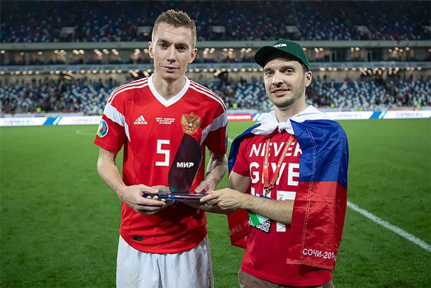 Во время матча сборных России и Казахстана на нашем сайте работало голосование за лучшего игрока матча. Вы выбрали не Марио Фернандеса, забившего единственный гол, а Андрея Семенова. Именно его наградил после победы наш читатель Марат Камалов. Он поехал на матч, так как победил в тесте, в котором надо было отгадывать игроков сборной по загранпаспорту.