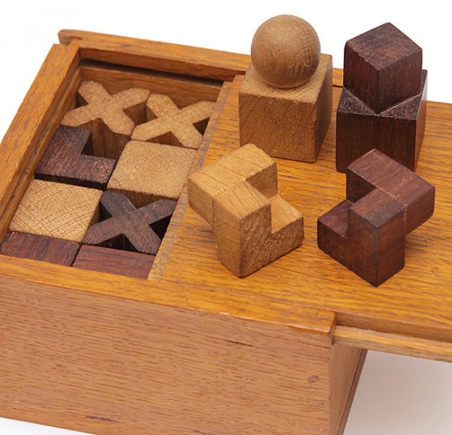 Первый, самый известный (и самый простой) набор был сделан в 1923-м: фигуры из древесины груши, нелакированные, тонированные олифой и черным компаундом, без цоколей, строго кубические, упакованы в серую коробку из плотного картона с бумажной наклейкой работы Йоста Шмидта.