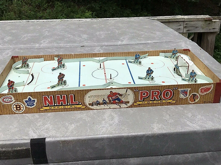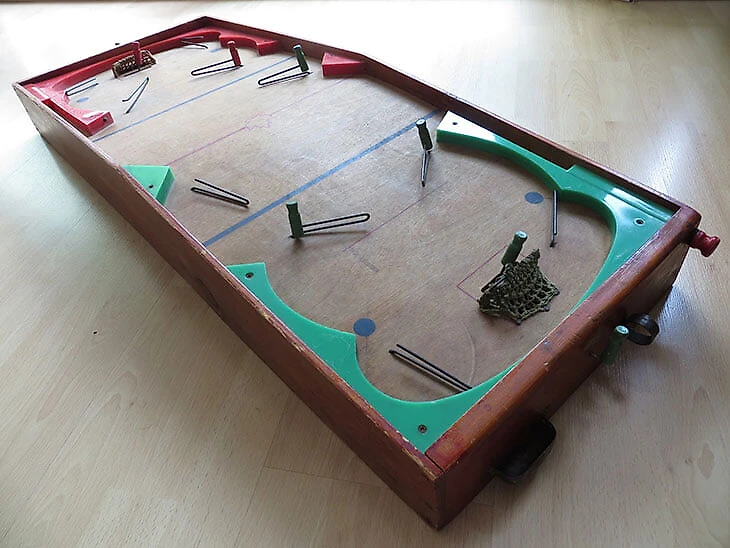 Мунро смастерил прототип из найденных дома досок, бельевых прищепок, бечевки и ручек от ящиков комода, а его жена пришила сетки на ворота. В каждой команде было по четыре хоккеиста, правой рукой игрок контролировал троих полевых, левой – вратаря. Правда, хоккеисты на людей вообще не походили, а вместо шайбы был шарик из подшипника, а чтобы он лучше катился, стол был с уклоном в обе стороны. Хокеем игру можно было назвать только номинально, она больше напоминала современный пинбол.