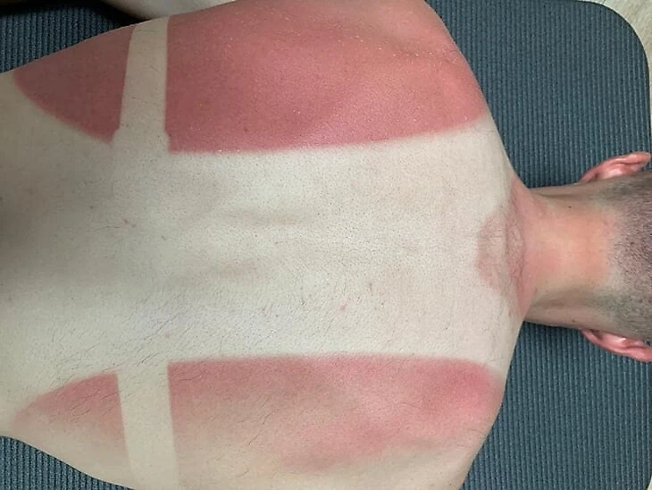 Следы от майки и пульсометра оставили необычный узор на его теле. Похоже, это первый загар Маса в новом сезоне.