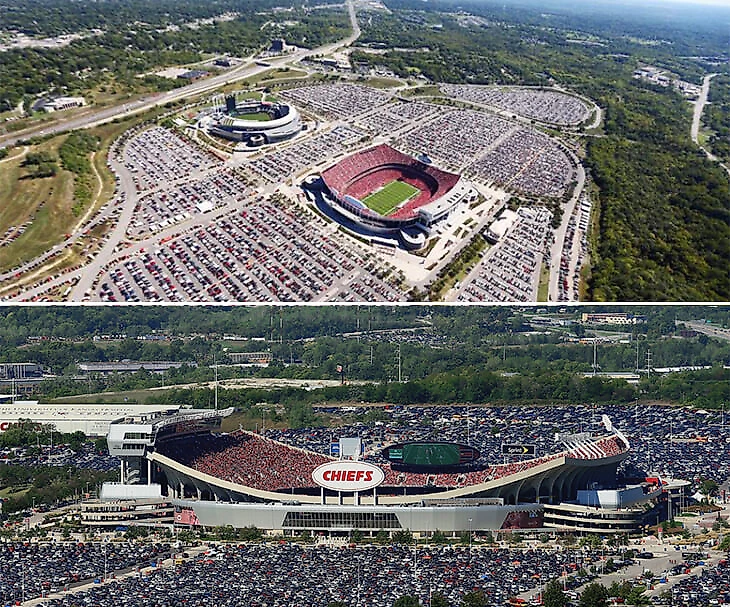 Спортивный комплекс «Truman в Канзас-Сити, построенный в 1973-м и состоящий из действующих стадионов: на ближнем плане «Arrowhead Stadium» команды НФЛ «Канзас-Сити Чифс», на дальнем – «Kauffman Stadium» команды МЛБ «Канзас-Сити Роялз»