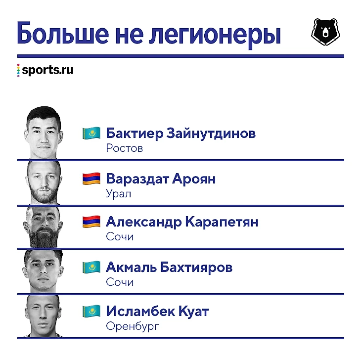 Правда, после 9 июня упростилась жизнь всего четырех клубов, у остальных нет легионеров из Армении, Казахстана и Киргизии. Ниже – полный список тех, кто теперь не попадает под лимит.