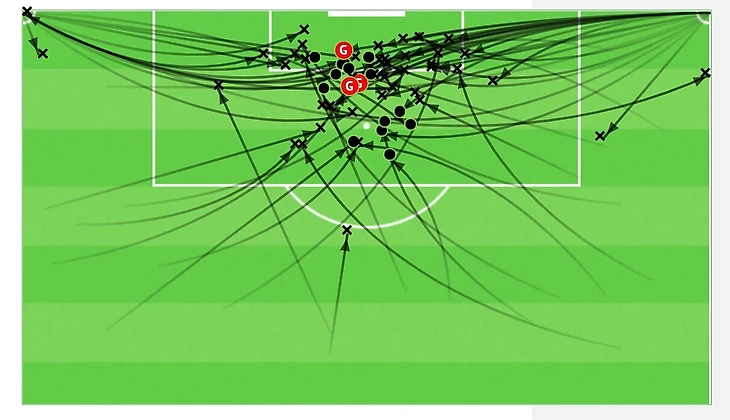 Во всех голах один сценарий – навес в центральную зону, где игроки, сбиваясь в одну зону, должны показать мастерство игры головой.