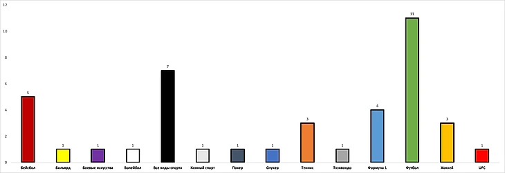 В результате мини-исследования я насчитал 41 референс в сторону 13 видов спорта. Очень солидный результат складывается из следующих составляющих.