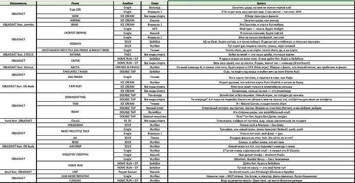 Самый популярный вид спорта, упоминаемый OBLADAET – футбол. Пожалуй, пояснять отсылки к самой популярной игре в мире нет необходимости, так как они очевидны. Но в паре треков Назар жестко панчит мадридский «Реал», что явно намекает на его клубные пристрастия в Эль Класико.