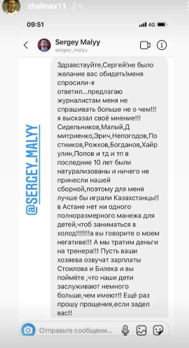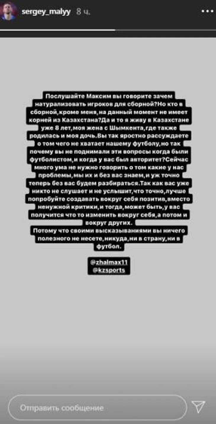 Малый ответил в сторис инстаграм: «Послушайте, Максим, вы говорите – зачем натурализовать игроков для сборной. Но кто в сборной, кроме меня, на данный момент не имеет корней из Казахстана? Да и то, я живу в Казахстане уже 8 лет, моя жена из Шымкента, где также родилась и моя дочь. Вы так яростно рассуждаете о том, чего не хватает нашему футболу, но так почему вы не поднимали эти вопросы, когда сами были футболистом и когда у вас был авторитет?