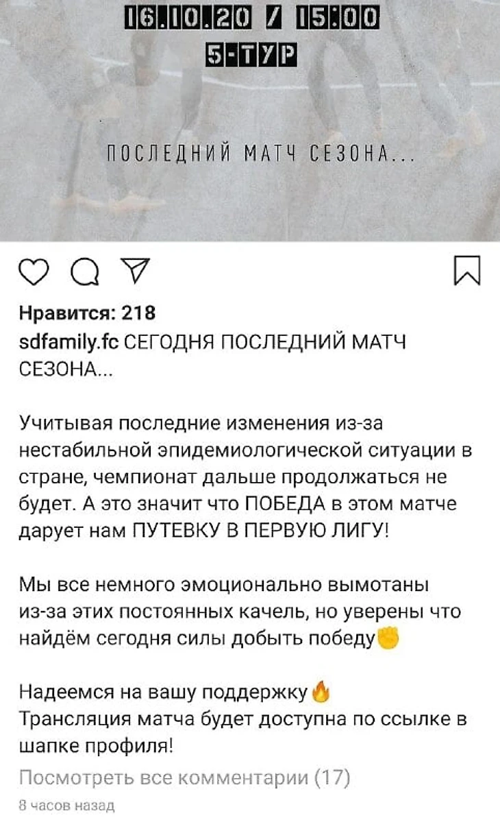 «Вчера клубы получили уведомление от ПФЛК о том, что второй этап соревнований отменен», – написал инсайдер Айдын Кожахмет. Эту информацию подтвердил и SD Family в инстаграм. Они выходили на матч с «Кызыл-Жаром М» с пониманием, что поражение перечеркнет их планы. Итоговые 9:0 в пользу петропавловцев оставляют столичную команду во второй лиге. По словам капитана команда и основателя клуба Дидара Сыдыкбека, им не хватило свежести: «мы играли через 3 дня после волевой победы над «Астаной», а соперники отдыхали целых 7 дней. Все эмоции оставили в той игре».