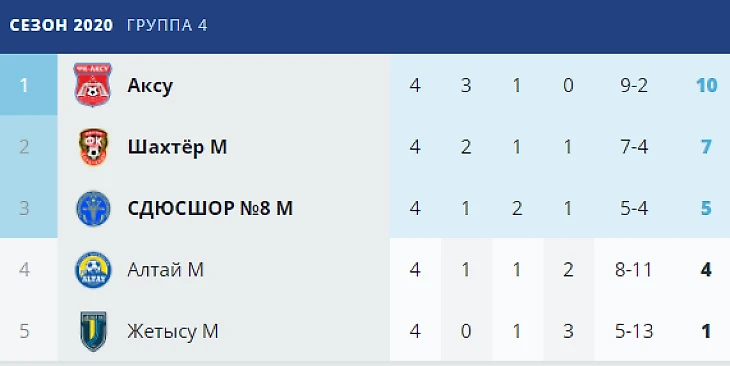 • В конференции «Восток» «Аксу» в последнем туре застолбил первое место. В группе 4 (Восток) первое место предсказуемо взял «Аксу», которого успели окрестить преемником «Иртыша». Клуб из Павлодарской области не без проблем добыл победу в последнем туре над «СДЮСШОР №8 М» на последних минутах.