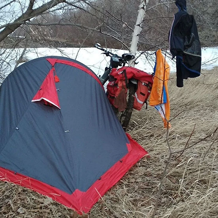 В поездках я всегда ночую в палатке – это принципиальная позиция. Сколько раз звали в гости, но я отказывался. Когда доезжаю до финальной точки, могу снять гостиницу или остановиться у знакомых. В пути – нет. Даже если на улице холодно, как однажды в Татарстане. Вроде стояло лето, но ночью ударили морозы. На утро вся палатка оказалось во льду, чтобы не околеть, согревался газовой горелкой.