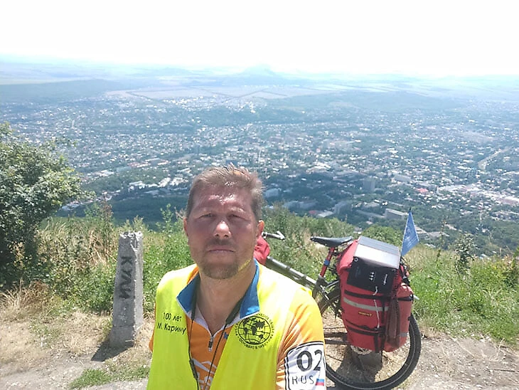 Гуляя по долине Эльбруса, они встретили велосипедиста Александра Иванова. Во время короткого диалога выяснилось, что 38-летний Иванов приехал на Кавказ из Уфы на велосипеде – почти 2500 километров, чтобы покорить пик башкирского поэта Мустая Карима.