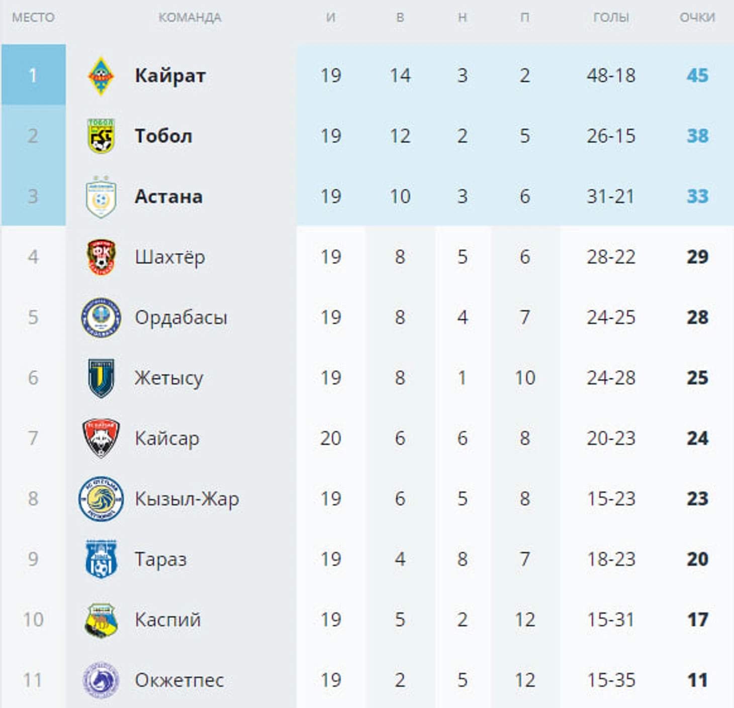 Интрига осталась лишь в борьбе за еврокубки: на заветную четвертую строчку претендуют «Шахтер» и «Ордабасы». Горняки, разгромившие в этом туре «Каспий» (4:0), опережают южан на одно очко.