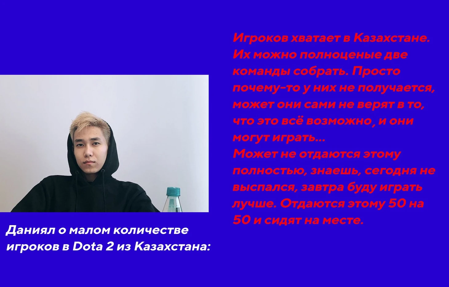 При этом Даниял отметил, что в киберспорт попасть не так сложно: «В Казахстане игроков хватает. Можно собрать полноценные 2 команды, Просто почему-то у них не получается, может они сами не верят в это, что это все возможно, и они могут играть… Может, не отдаются этому полностью, знаешь, сегодня не выспался, завтра буду играть лучше. Отдаются этому 50 на 50 и сидят на месте.»
