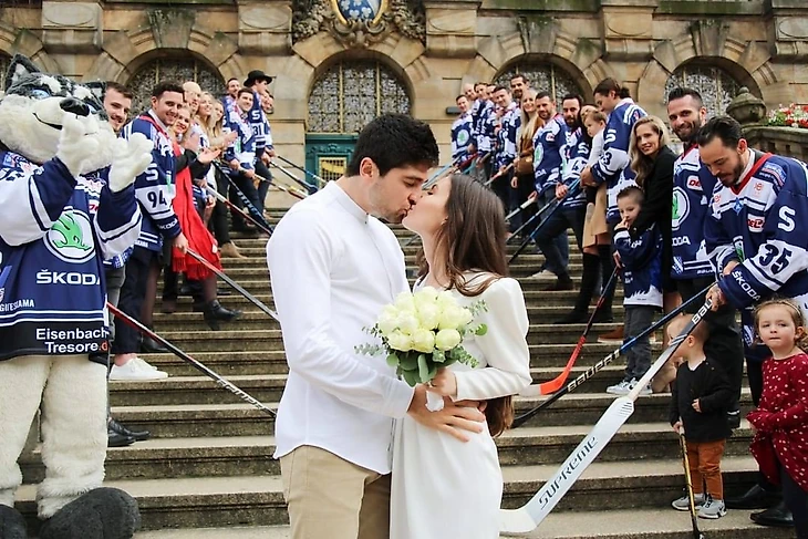 Одноклубники Тривино с таким подходом не согласились. Хоккеисты встретили пару на выходе из местного загса и устроили сюрприз.