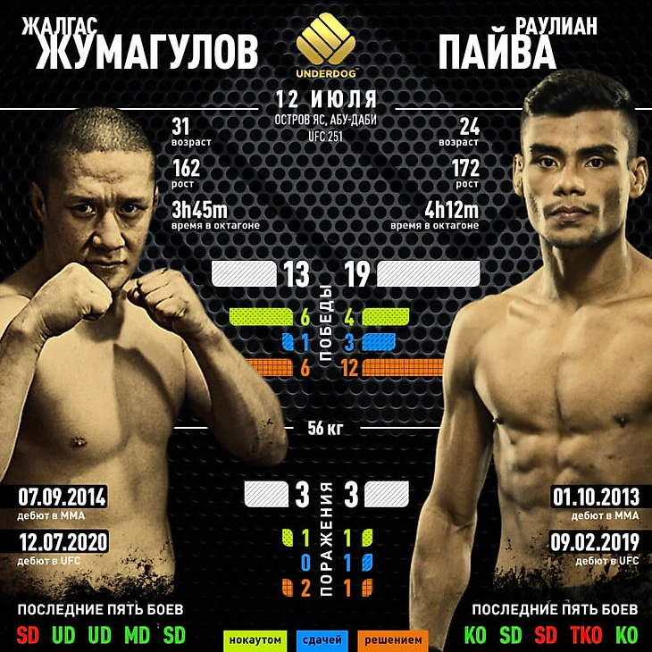 Жалгас Жумагулов считается одним из самых перспективных казахстанских бойцов в современных смешанных единоборствах. За свою карьеру он одержал 13 побед, 5 поражений и ни один бой не закончился ничьей. После дебюта в UFC Жалгас так и не смог одержать ни одной победы, чем подпортил свой рейтинг. Он проиграл дебютный бой против бразильца Раулиана Пайвы, но смог показать характер, когда продолжил бой после запрещенного приема. Второй бой против бойца UFC Амира Альбази из Швеции оказался куда менее зрелищным. Жумагулов пытался прессинговать в начале первого раунда, но сразу же пропустил точный удар от соперника. Остаток боя прошел примерно на равных: бойцы продолжали обмениваться ударами. Однако начиная со второй половины второго раунда, Альбази смог перехватить инициативу и начал чаще наносить точные удары. Под конец, когда преимущество стало очевидным, Амир стал избегать обмена ударами и много двигался. В итоге швед победил единогласным решением судей.