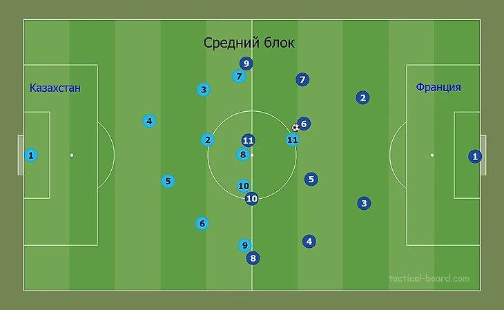 3. Тайминг. Очевидно, что наша сборная не сможет на равных бороться в одном темпе с французами, тогда чтобы не было перегруза защитников комбинировать низкий и средний блоки (прессинг у ворот и на половине поля соперника), что даст возможность создать условия для возникновения триггеров контратаки.