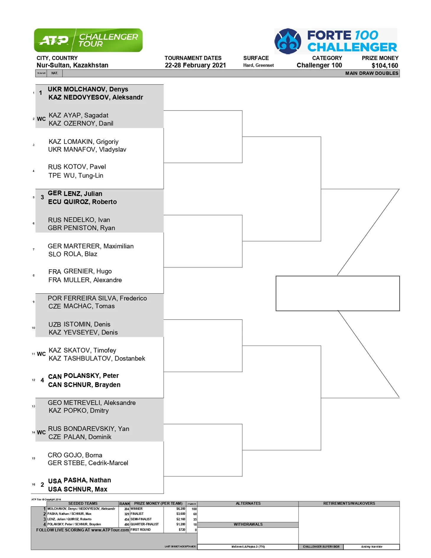 Стали известны результаты жеребьёвки турнира Forte Challenger 100 в парном разряде - сообщает пресс-служба ФТК. Наш Александр Недовесов в паре с украинцем Денисом Молчановым посеяны в парном турнире под первым номером. На старте они сыграют против казахстанцев Сагадата Аяпа/Данила Озерного. На соревнованиях в Нур-Султане выступят еще семь казахстанских дуэтов. Денис Евсеев в паре с представителем Узбекистана Денисом Истоминым на старте сразятся с португальцем Фредерико Феррейра Сильвой и чехом Томашем Мачаком. Тимофей Скатов и Достанбек Ташбулатов сыграют с канадской парой Петр Полански/Брайден Шнур. Соперниками Дмитрия Попко и грузина Александра Метревели станут россиянин Ян Бонадревский и чех Доминик Палан. С полной версией турнирной сетки можно ознакомиться ниже.