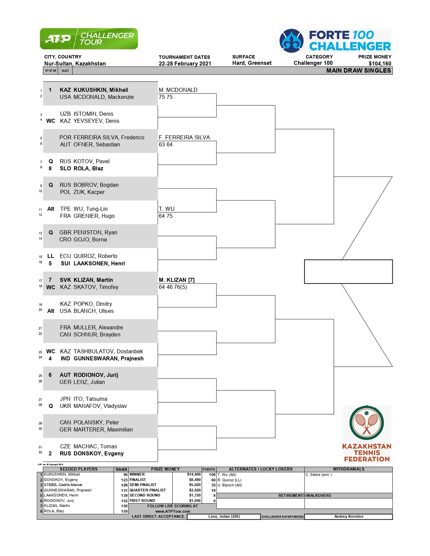 Казахстанец Михаил Кукушкин, посеянный на турнире под первым номером, уступил американцу Маккензи Макдональду, занимающему 139-ю строчку рейтинга ATP, со счётом 5:7, 5:7 в первом круге турнира Forte Challenger 100 в Нур-Султане. Уже на старте турнира жребий свел казахстанского теннисиста с Маккензи Макдональдом, который на последнем Открытом чемпионате Австралии навел много шороху, дойдя до 1/8 финала, где проиграл будущему финалисту, россиянину Даниилу Медведеву. Кукушкин имел неплохие шансы взять первый сет, однако, при счете 5:6 он проиграл гейм на своей подаче, а затем уступил партию. Во втором сете игра была равной, однако, в 11 гейме казахстанец потерял подачу и проиграл матч.